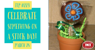 If you have ever tried to insert lollipop sticks into any number of sandwich cookies, you probably felt about as efficient as a tortoise. Thanks to a quick and easy tip shared by RCI member, Kimberly Mitchell with Olympian Candies, you can pump out as many chocolate-covered sandwich cookies on a stick as your heart’s content and still have time to decorate them for National Something on a Stick Day! Inserting wooden popsicle sticks into double-stuffed sandwich cookies will make this process much easier and efficient than using lollipop or sucker sticks. With a little embellishment, wrapped in a clear candy bag and tied with a pretty little ribbon, Olympian Candies can’t keep their chocolate-covered-sandwich-cookies-on-a-stick on the shelf!