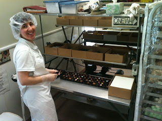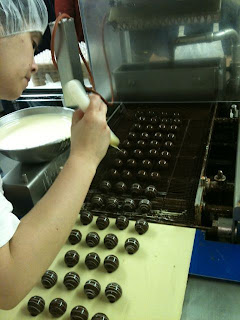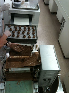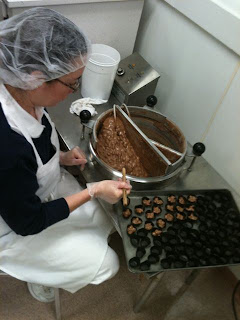 Learning to make peppermint cremes. After they set, they will be enrobed in chocolate.