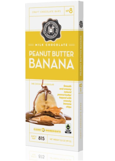 This chocolate bar embodies the classic flavors of banana nut bread with dark chocolate, crisp banana pieces and toasted almonds.