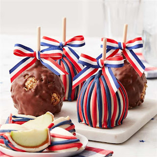 Have you ever experienced problems with caramel slipping off your caramel apples? The wax on your apple may be the culprit. By simply wiping each apple with a damp cloth prior to dipping, you can remove the waxy residue that rests on the apples. An apple naturally produces a waxy film to protect itself, however, in some instances additional food-grade wax is added by suppliers to further increase an apple’s shelf life. For this reason, it could save you time and effort to request unwaxed apples from your supplier, if they do add wax to their apples. If that doesn’t help, consider adding white compound to your caramel at a 5 to 1 ratio to help it better adhere to the apple. If you can’t wait to test this out, here’s a few summer-inspired caramel apples ideas to try too! Patriotic Caramel Apples Show your patriotic stripes with drizzles of red and blue over a white chocolate coated caramel apple.