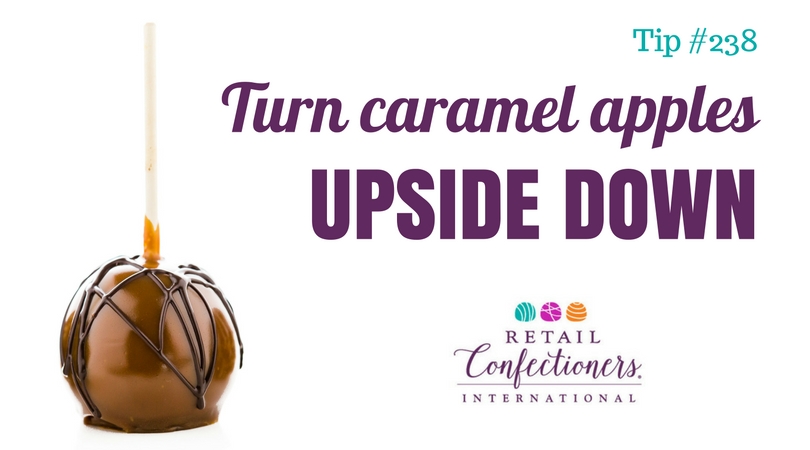 Thanks to this tip, long-time RCI member, Fascia’s Chocolates of Waterbury, Connecticut, started flipping their apples after 53 years of practicing the traditional method of inserting sticks through the top of the apple, near the stem. Carmen Romeo, of Fascia’s Chocolates, says their apples now set more steadily and less caramel seems to gather on the bottom.