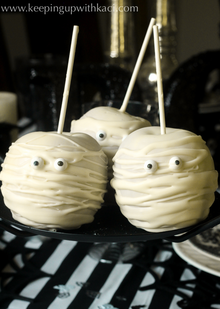 If you’re looking for something less spooky, these cute pumpkin pretzels are as easy as they are cute. Embellish orange coated pretzels with sprinkles and a green M&M or candy-coated sunflower seed as the finishing touch. Click here to see how Simply As That blog, gave their pumpkin pretzels personality by adding faces.
