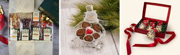 Here's some ideas of gifts for customers to treat themselves (from left to right): Rheo Thompson Candies offers a collection of customers' favorite sweet and salty snacks; treat yourself to new holiday decor, filled to the brim with chocolates from Marie's Candies; the gift of solid chocolate ornaments from Enstrom Candies help customers count down the days to Christmas with a sweet and decadent treat each day.